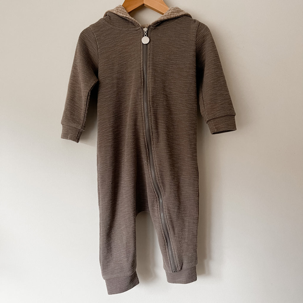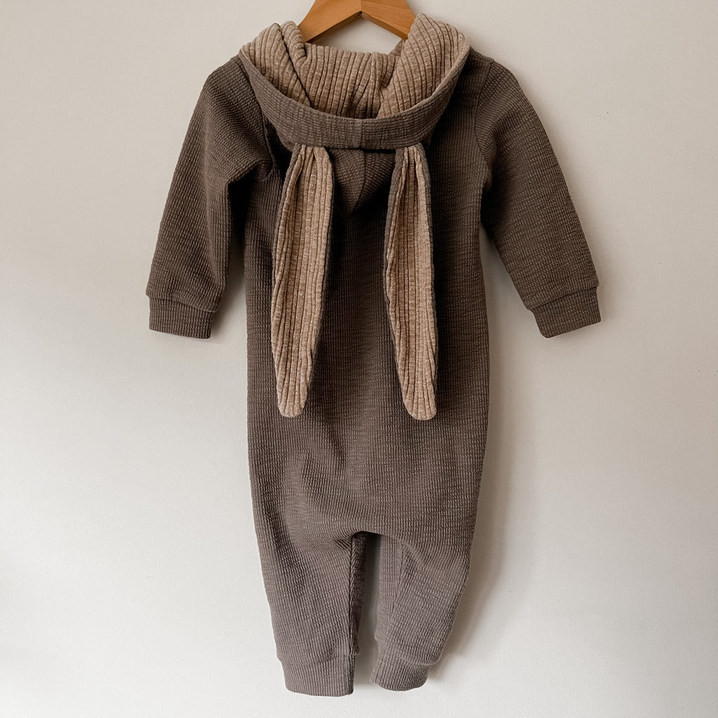 Adorable full length long sleeved zip up romper with hooded bunny ears.