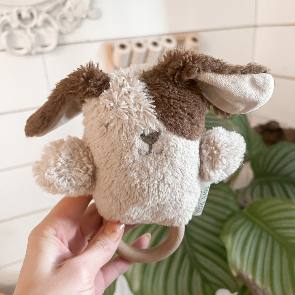 Adorable ‘Dave dog’ soft rattle toy and teether from O.B. Designs Australia. suitable for ages 3 months+.
