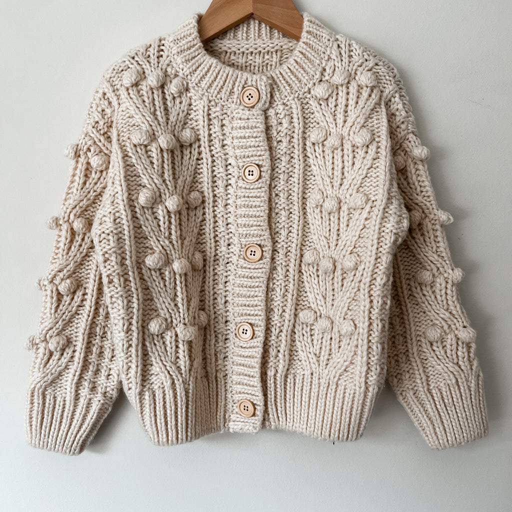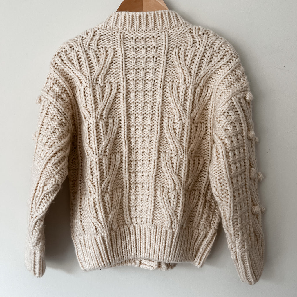 Adorable button up cable knit cardigan with dainty pom pom embellishments.