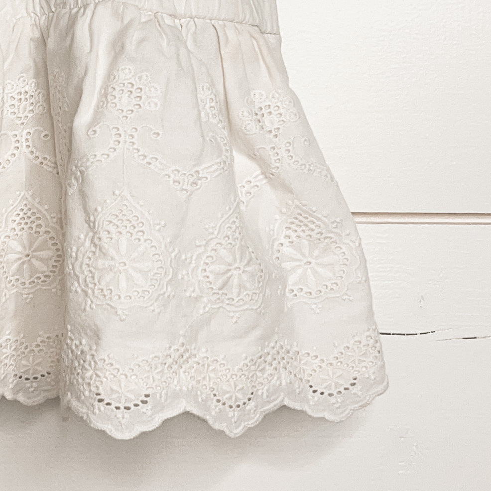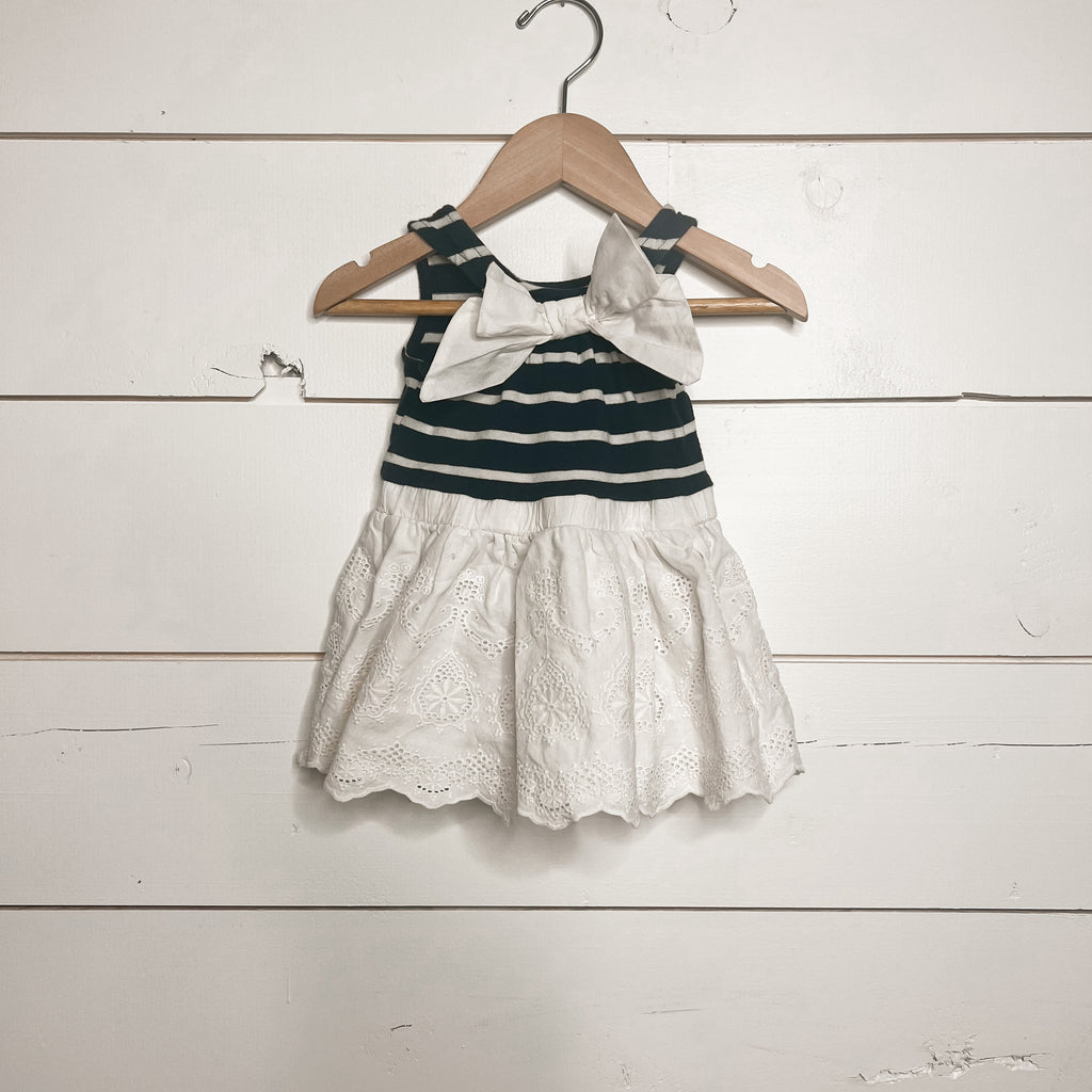 Colour: Navy blue and white stripes with white eyelet lace skirt.