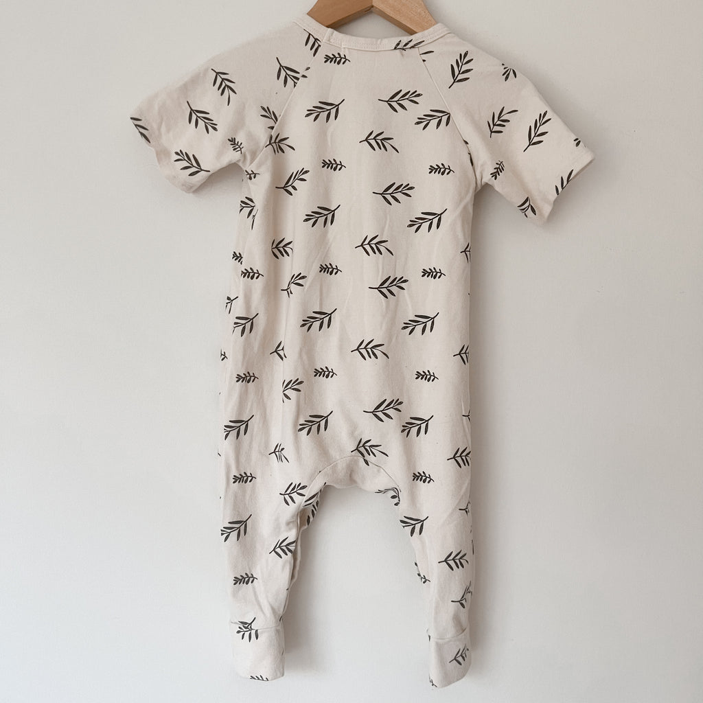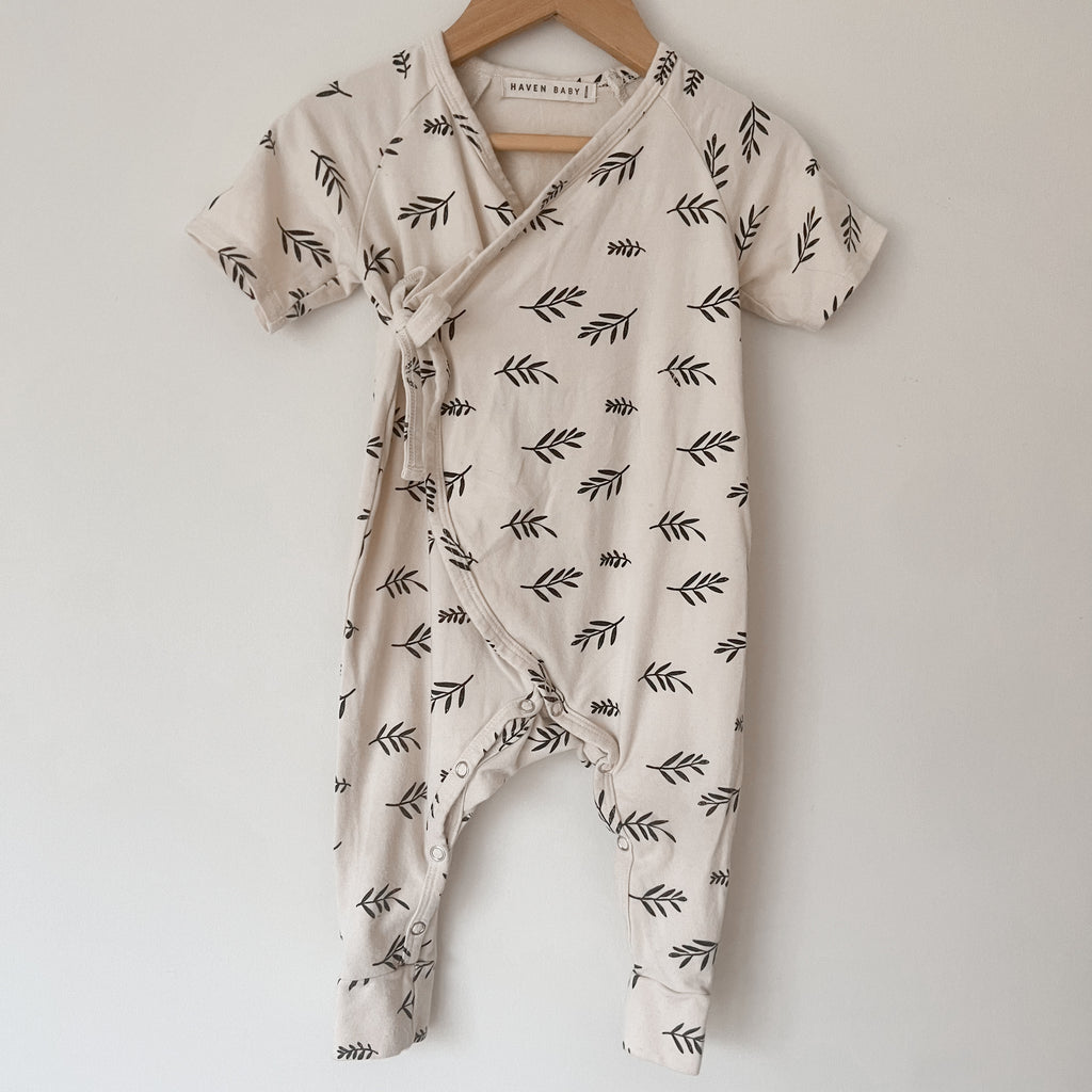 Size 6-12 months. Short sleeved Kimono style romper with snap and hand tied closures.