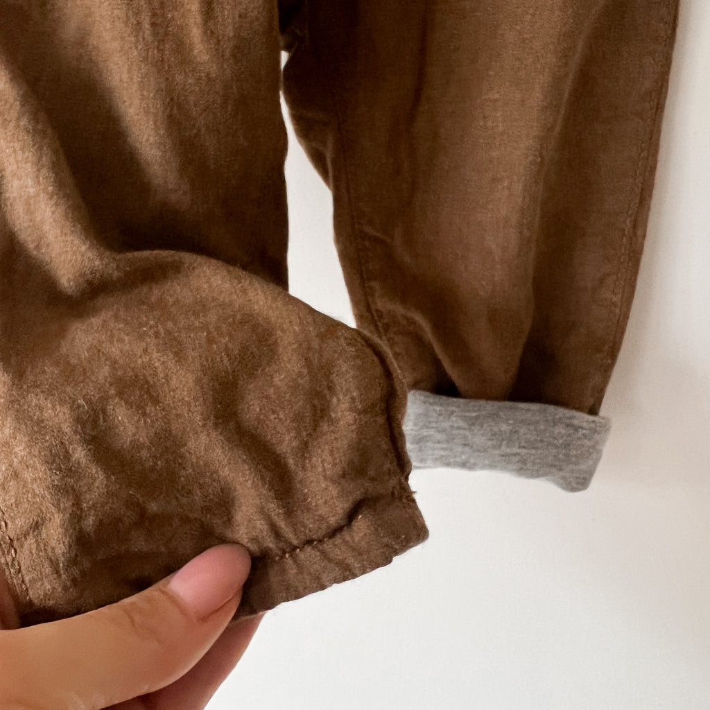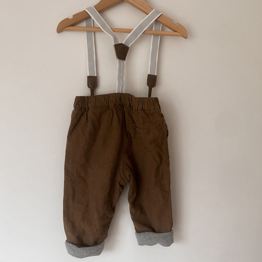 Size 6-12 months. Cotton pants with adjustable waistband, removable suspenders (also adjustable in length) and soft inner lining.
