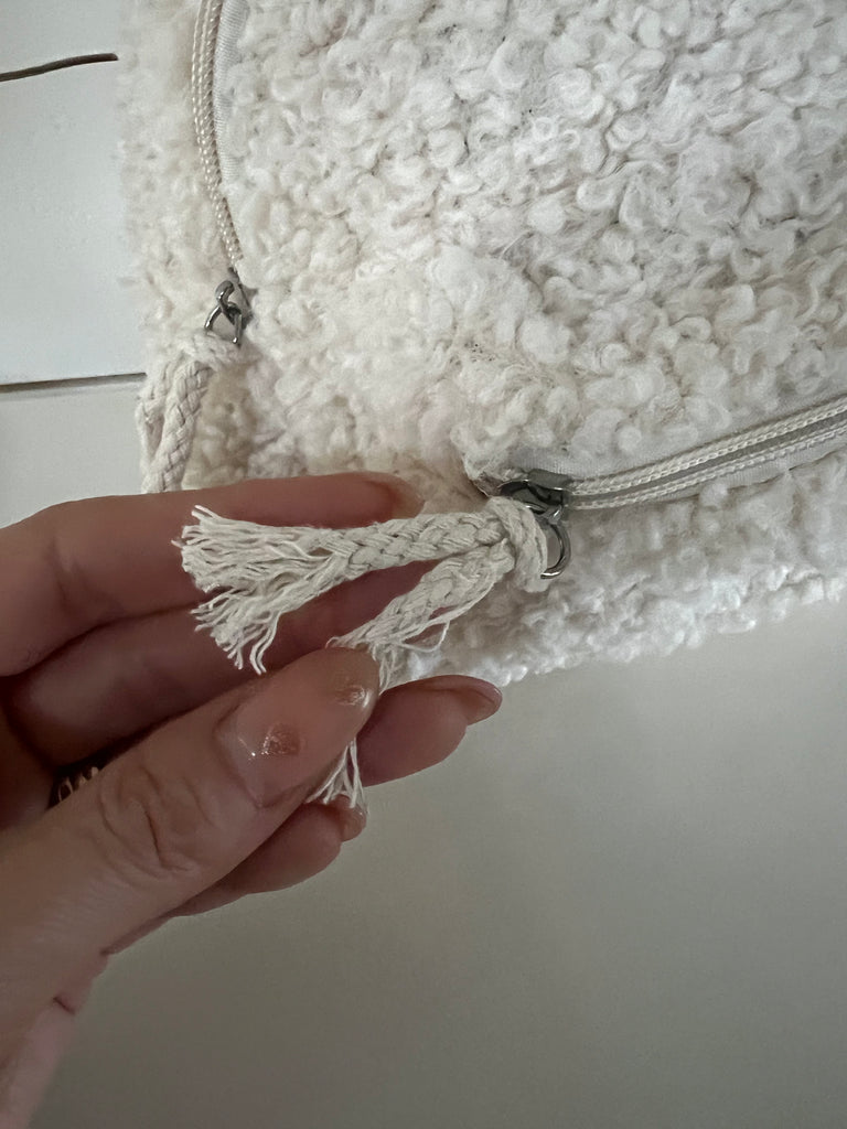 This adorable faux Sherpa backpack is the perfect size for your little one to take on any adventure! The adjustable straps allow for it to be worn in three ways -as a traditional backpack, crossbody or over the shoulder. Featuring a PUL Vegan leather bottom with two zip compartments and measuring at roughly 10x10”.