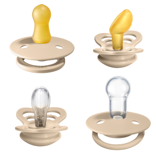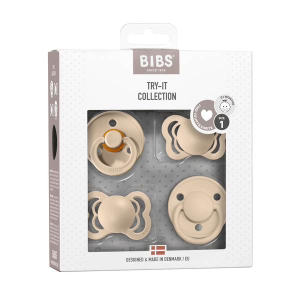 In this collection, you will have a pacifier from 4 different categories (Colour, De Lux, Supreme, and Couture), with a selection of all nipple types (Round, Symmetrically, and Anatomically) and materials (Natural Rubber Latex and Silicone) IN SIZE 1 (0-6m) for you and your baby to test and find your preferred BIBS pacifier.