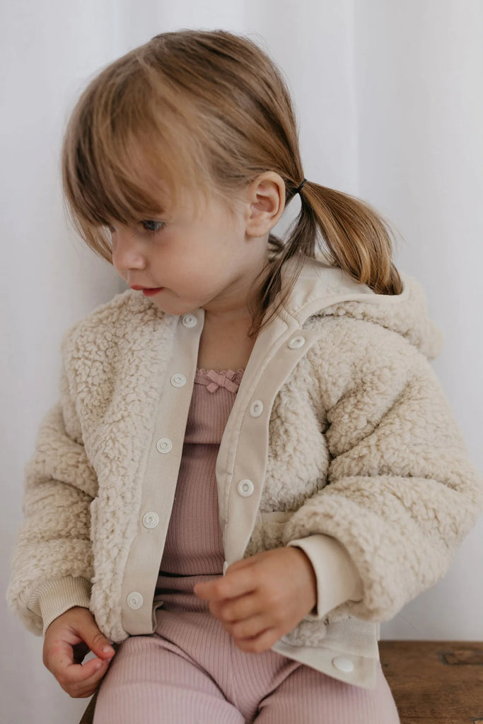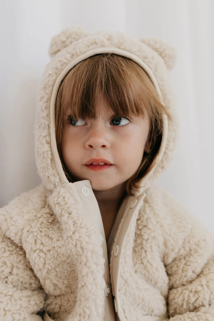 We love this teddy because it is incredibly soft and fluffy, while also being lightweight and easy to care for. Constructed with a snap closure, two front pockets and adorable teddy bear ears on the hood. The stretchy ribbed cuffs prevent the sleeves from ridding up, allowing for you to comfortably size up and enjoy this piece for several seasons!
