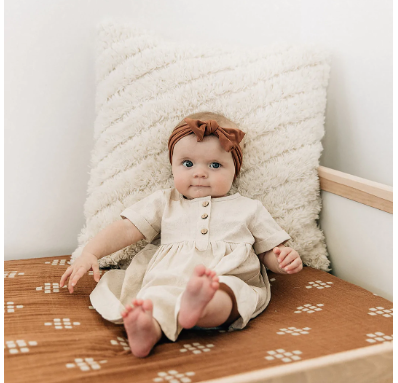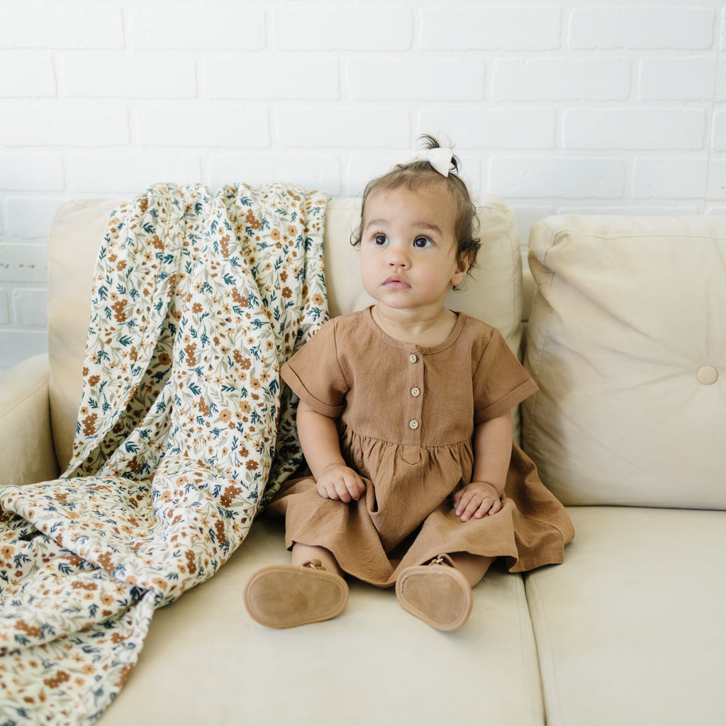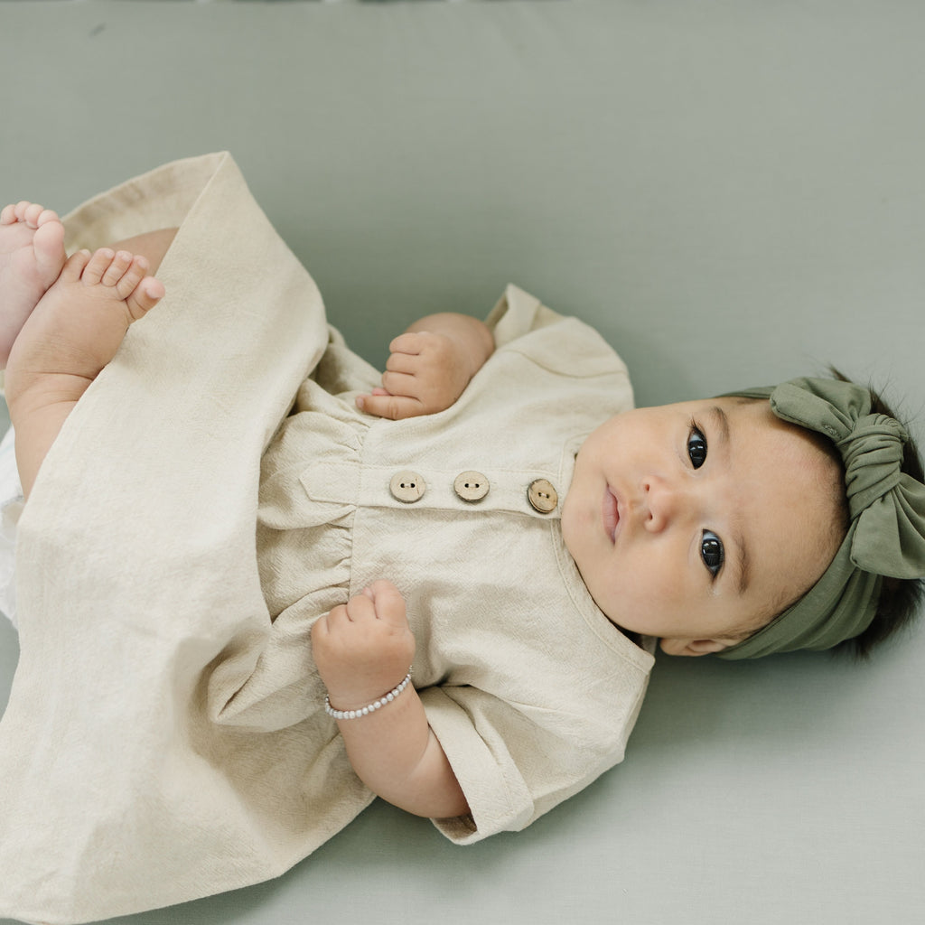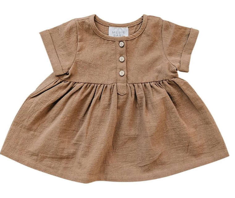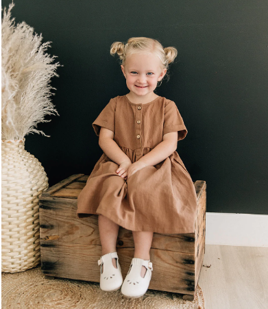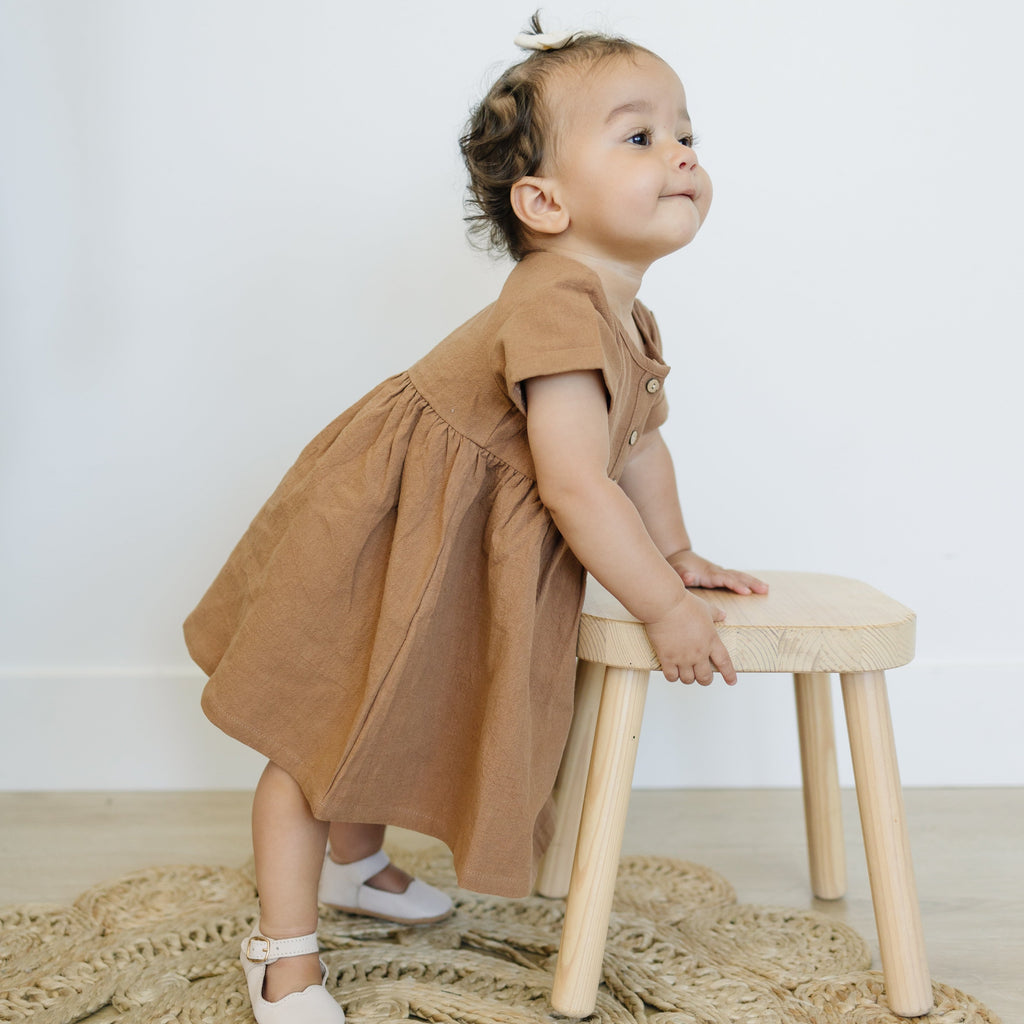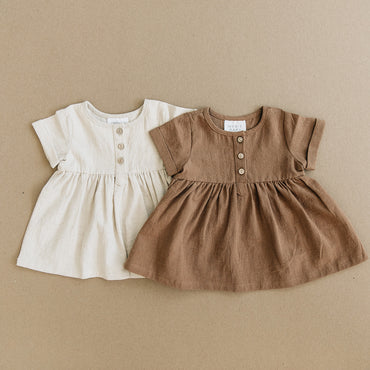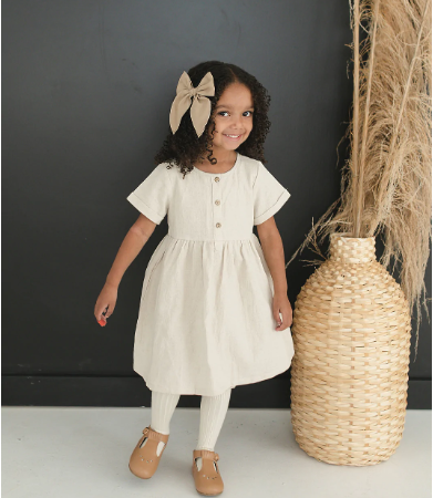 This cotton linen dress with functioning wooden buttons will fit seamlessly into your child's wardrobe! Pair with our cotton knit sweater or cardigan and a pair on knee high socks to easily transition this piece from spring to summer.