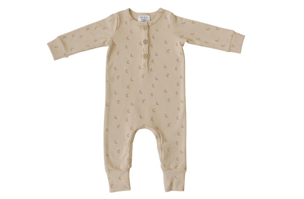 A nice medium weight jersey with lots of stretch for easy wear. Featuring functional wooded buttons on the front placket and snaps along the inner leg for easy diaper changes!